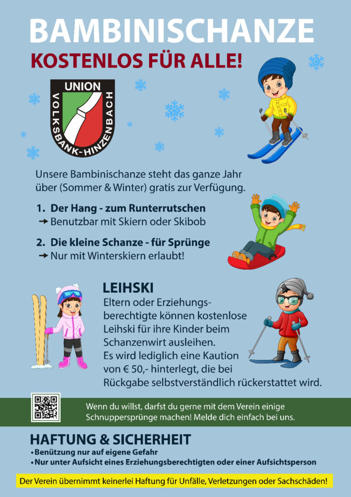 Weiters besteht die Möglichkeit, dass Eltern oder Erziehungsberechtigte beim Schanzenwirt kostenlos Kinderski ausleihen. Es ist lediglich eine Kaution von € 50,- zu hinterlegen, die bei Rückgabe der Ski zurückerstattet wird.