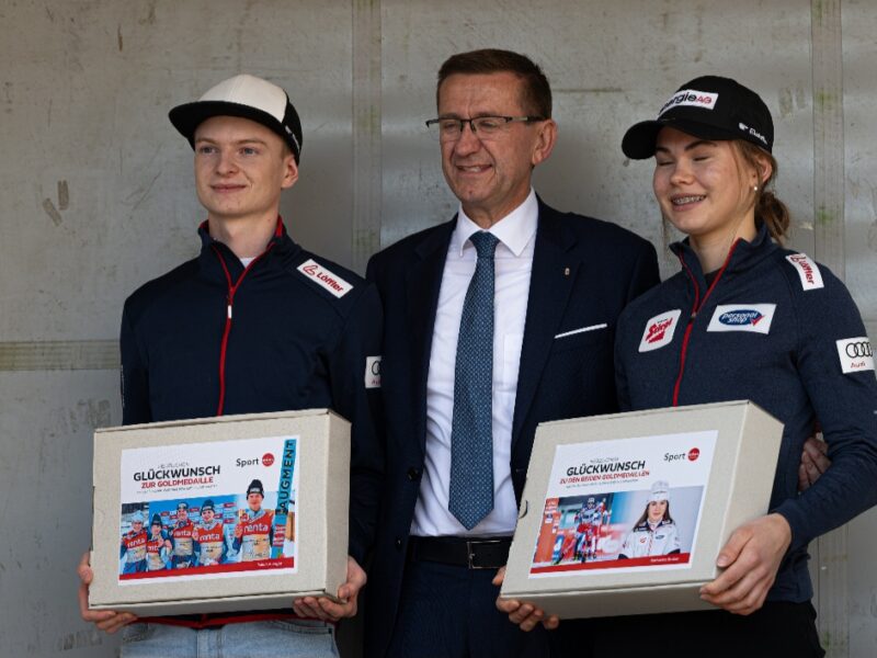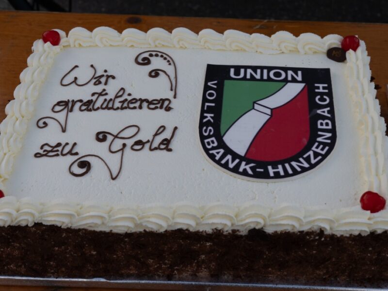 Auf der Bühne beantworteten sie in einer kleinen Talkrunde Fragen und durften sich über Glückwünsche und Präsente freuen. Landesskiverbandspräsident Klaus Kumpfmüller überreichte Gruber und Auinger ein zweites Mal Gold, in Form eines Golddukaten. Vom UVB Hinzenbach gab es eine hübsch verzierte Torte und für ein wenig Zeit zum Entspannen, Reisegutscheine.