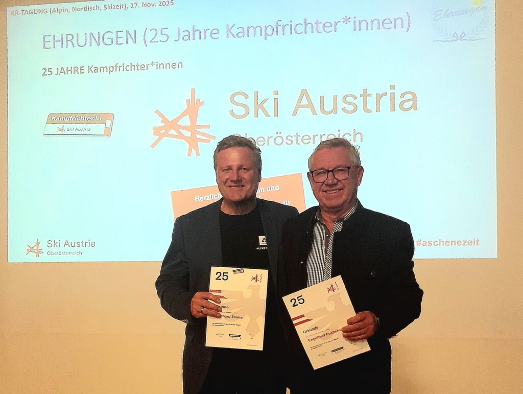 Im Rahmen der diesjährigen Kampfrichtertagung in Ansfelden am 17. November 2025 wurden Bernhard Zauner und Engelbert Fuchshuber für ihre 25-jährige Tätigkeit als Kampfrichter feierlich geehrt. Die Anwesenden würdigten das langjährige Engagement der beiden, die durch ihre zuverlässige und gewissenhafte Arbeit einen bedeutenden Beitrag zum reibungslosen Ablauf zahlreicher Wettkämpfe geleistet haben.