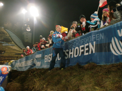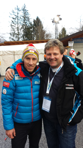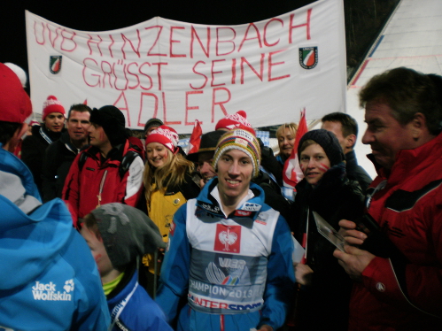 Bischofshofen (AUT), 06.01.2014 – Die Sensation ist perfekt, die UVB Hinzenbach steht Kopf! Thomas Diethart (UVB Hinzenbach) bewies beim letzten Springen der Vierschanzentournee Nervenstärke und sichert sich mit einem Sieg in Bischofshofen den Tournee-Gesamtsieg. Didl katapultierte sich in den letzten Tagen völlig überraschend zum neuen Überflieger und schaffte den ganz großen Coup. Der Rookie sicherte sich mit 1012,6 Punkten den Gesamtsieg der Traditionsveranstaltung in seinem achten Weltcupstart! Das I-Tüpfelchen auf den Vierschanzentournee-Triumph war der Tagessieg in Bischofshofen. „Es ist so geil! Ich habe den Sprung so gut getroffen. Es war zwar wieder der Pendler drin, aber ich habe ihn gut durchgezogen. Es ist einfach nur saugeil“, ließ Didl seiner Freude nach dem Wettkampf freien Lauf.